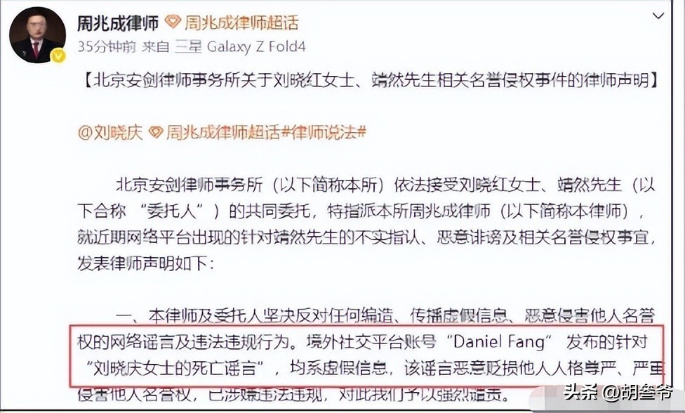 3月26日,其妹妹刘晓红也委托律师发布声明,澄清谣言与家人无关,坚决谴责恶意造谣行为。