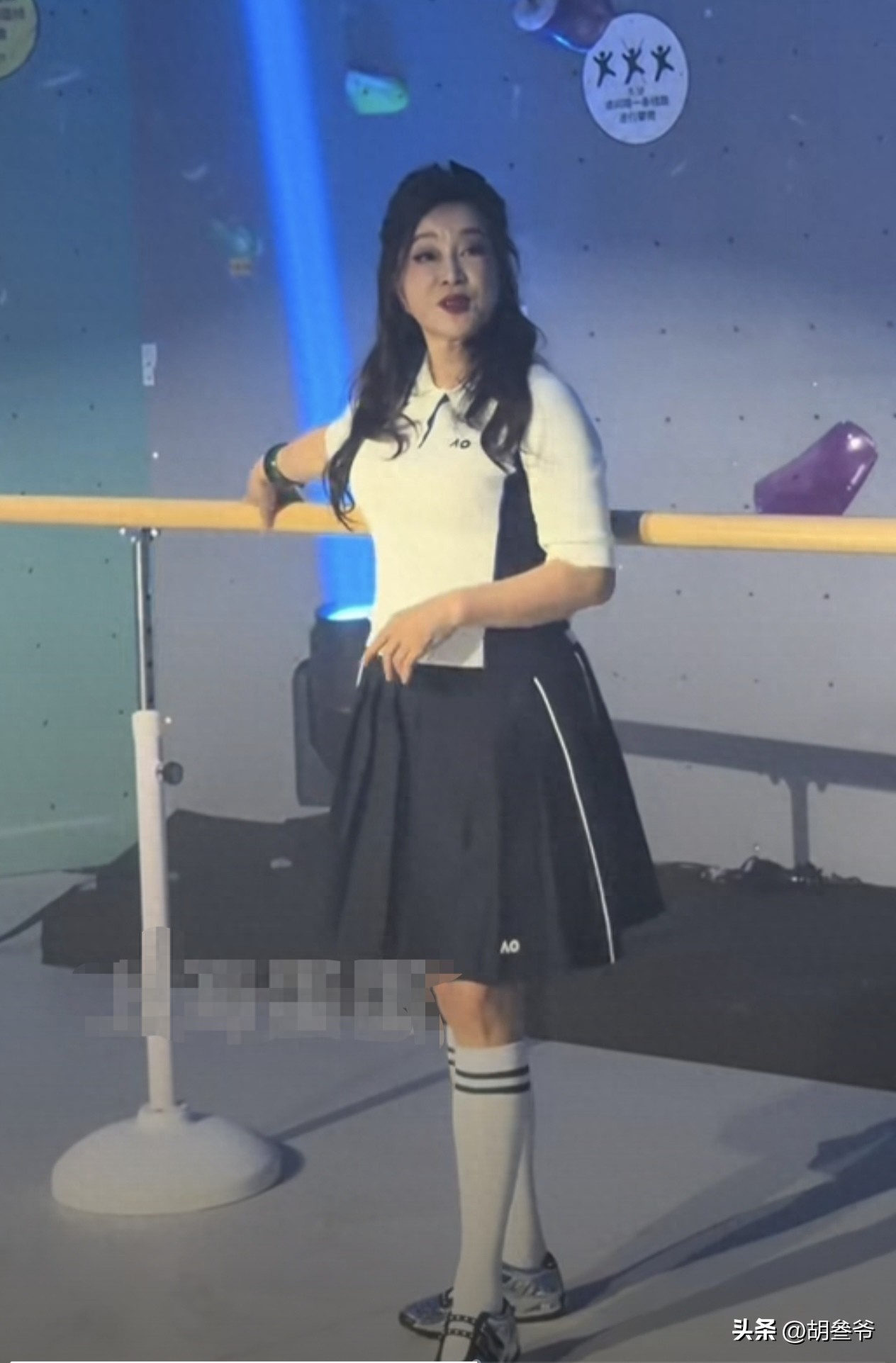 当天她把一头乌黑长发高高扎起,利落又显精神,上身是简约的白色Polo短袖,下身配一条藏蓝色百褶半裙,再搭上长筒袜和当下正火的芭蕾风运动鞋。